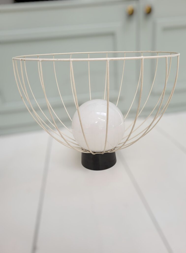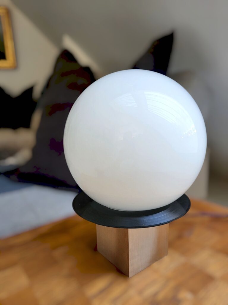 En uppcyclad bordslampa som passar utmärkt på den lilla byrån eller i en bokhylla. Lampskärmen är av vit glas som är placerad på en gammal vinylskiva. Lampfoten är en kubus av aluminium med detaljer av gildingvax.