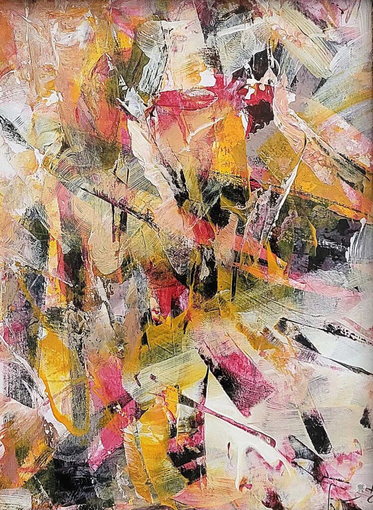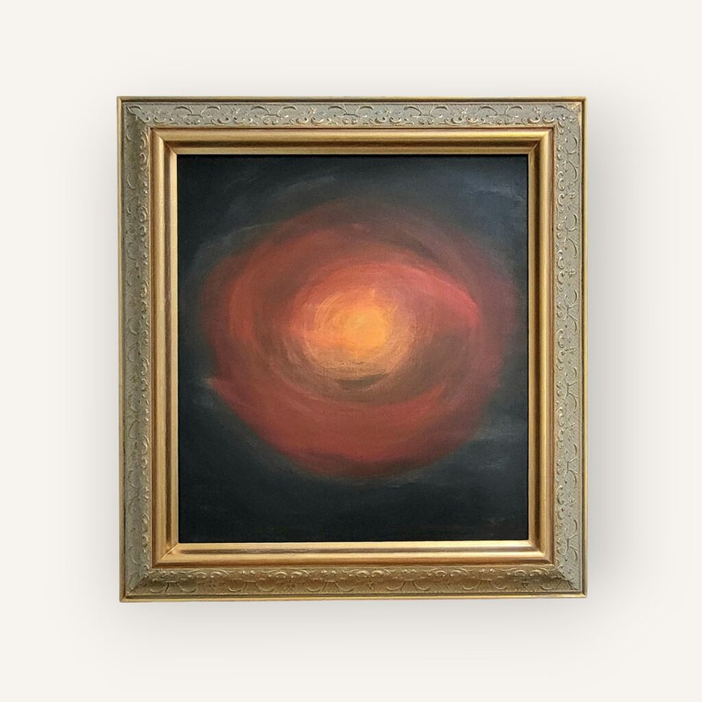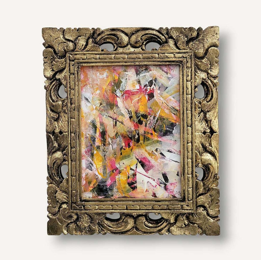 Akrylmålning, canvas, ram i gult med röda detaljer och antik finish