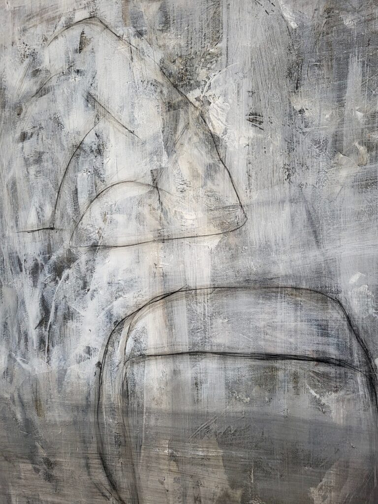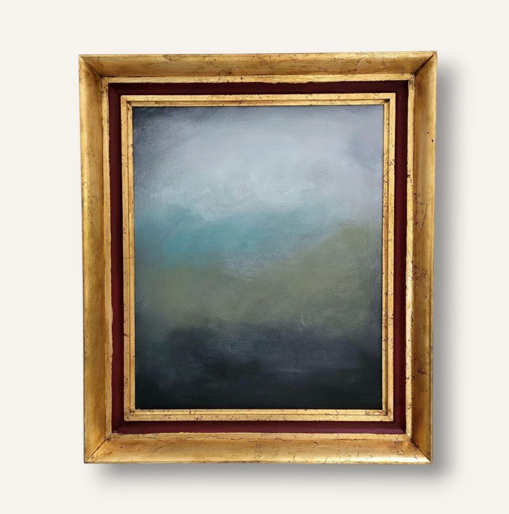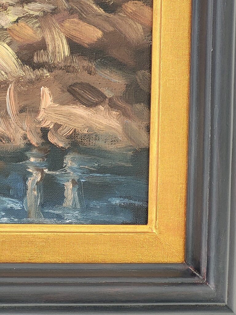 Akrylmålning, canvas, redesignad massiv träram i svart med antik patina och guldvaxad innerram