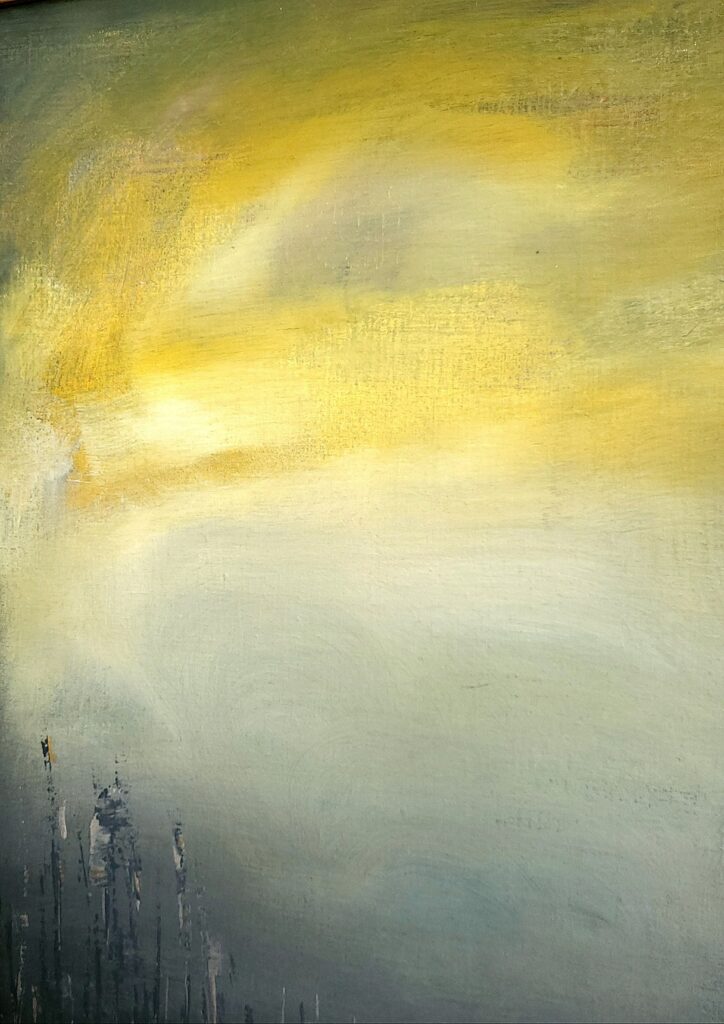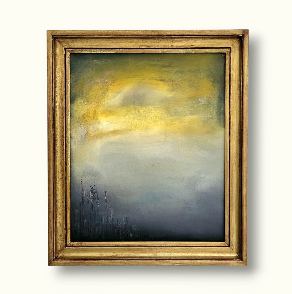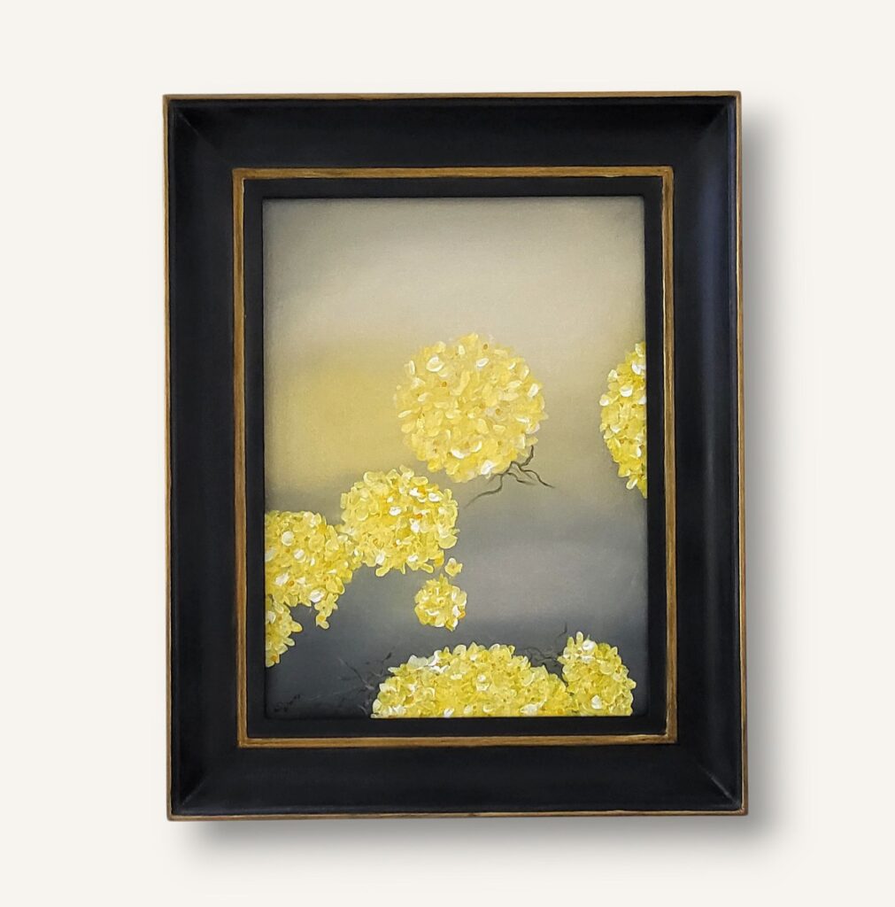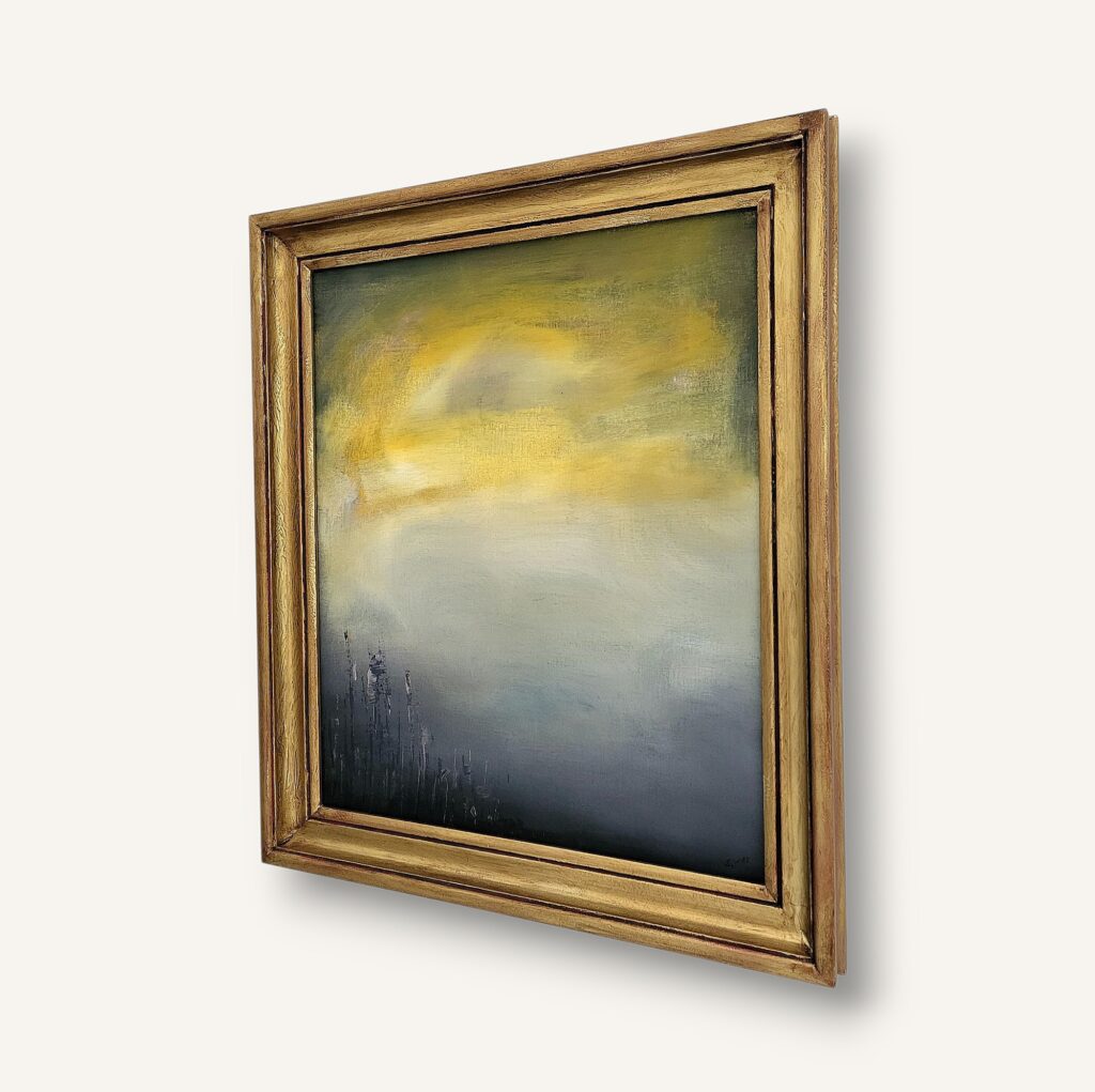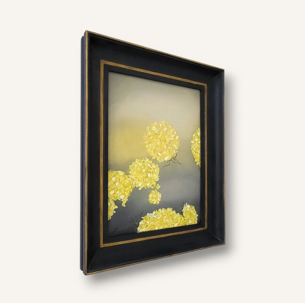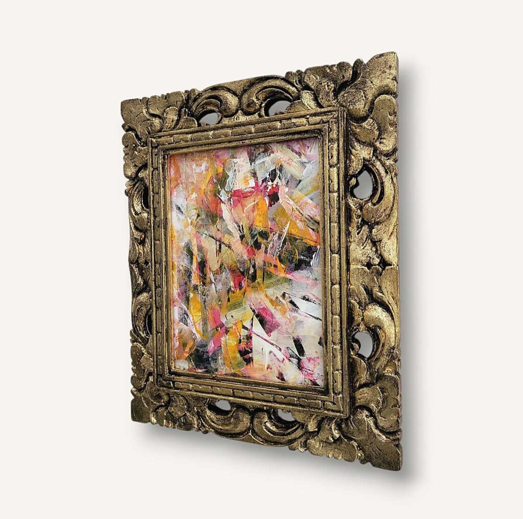 Akrylmålning, canvas, redesignad massiv träram i gult med patinerade detaljer