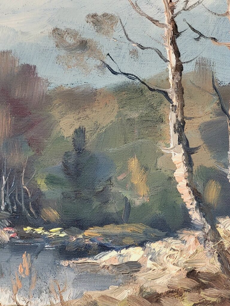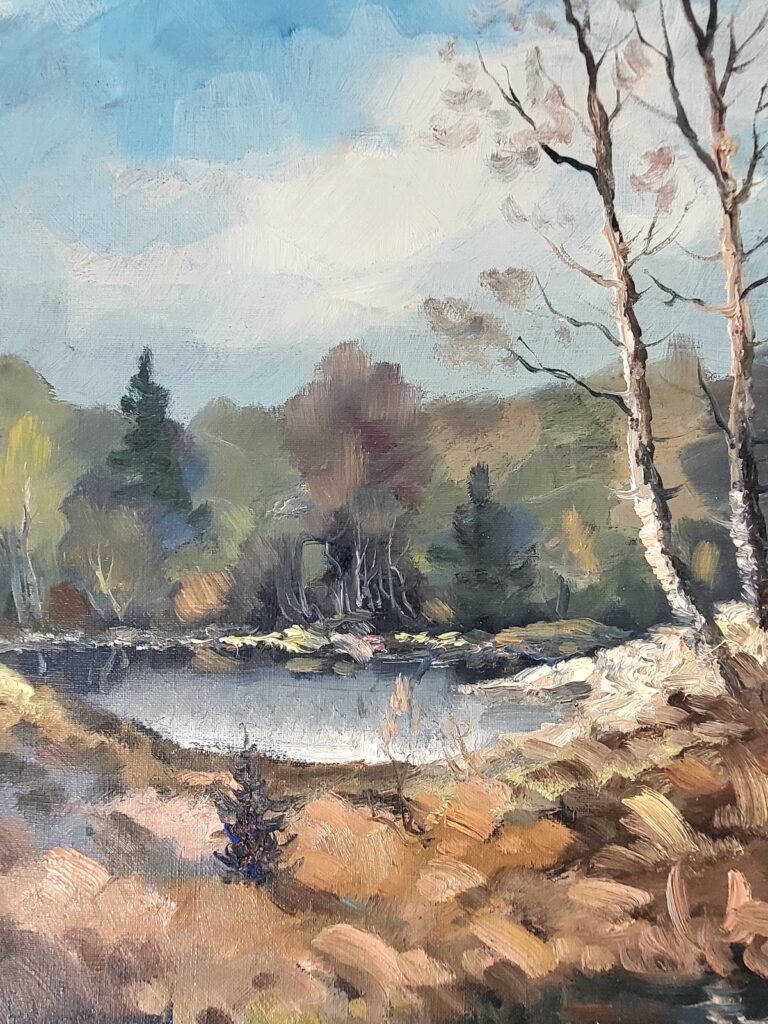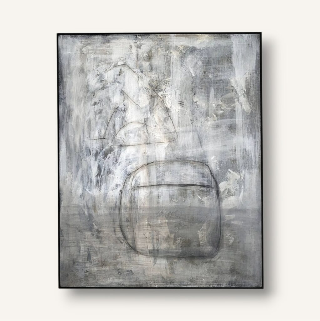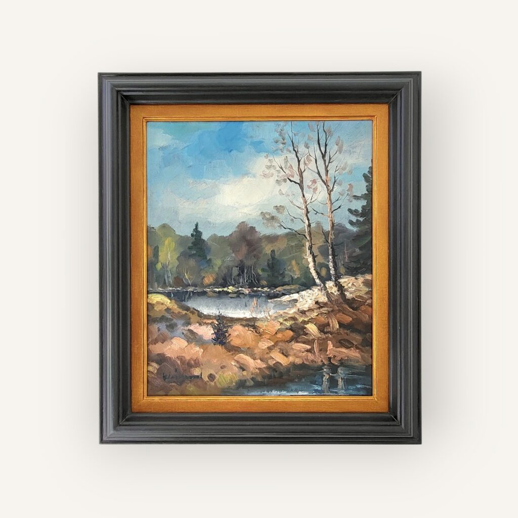 Akrylmålning med akvarellteknik, canvas, svart tunn ram i trä